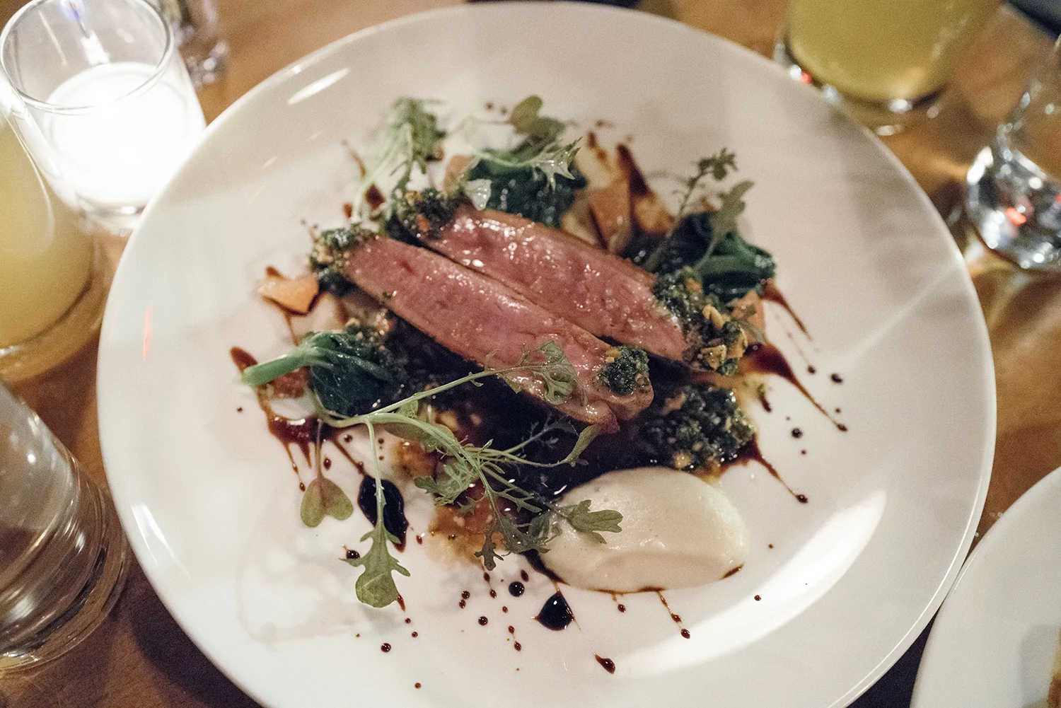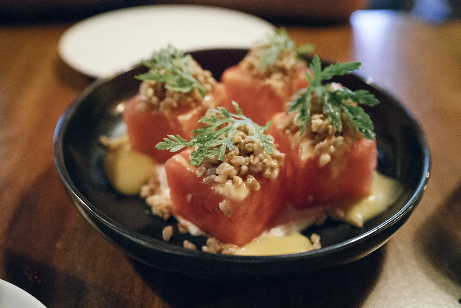Our first bite appeared in the form of juicy watermelon, creamy ricotta, and topped with farro for texture. A perfect appetizer that made us hungry for more.